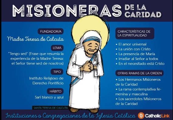 Misioneras de la Caridad (MC) es una congregación religiosa católica establecida en 1950 por santa Teresa de Calcuta para ayudar a los más pobres. La aprobación pontificia definitiva fue otorgada en 1965, durante el papado de Pablo VI.