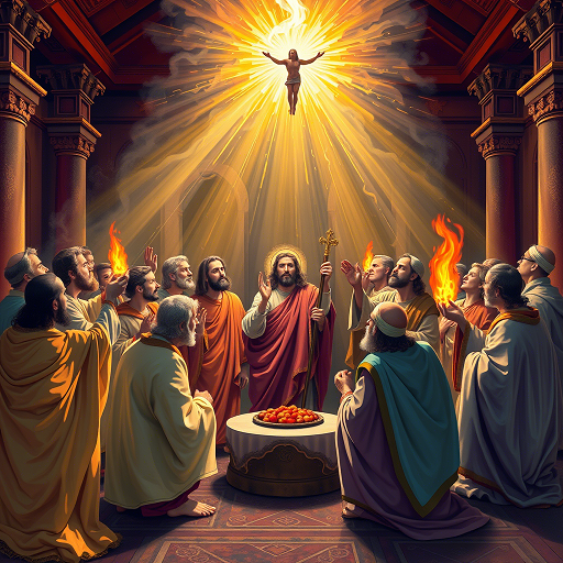 Al cumplirse el día de Pentecostés, estaban todos juntos en el mismo lugar. De repente, se produjo desde el cielo un estruendo, como de viento que soplaba fuertemente, y llenó toda la casa donde se encontraban sentados. Vieron aparecer unas lenguas, como llamaradas, que se dividían, posándose encima de cada uno de ellos. Se llenaron todos de Espíritu Santo y empezaron a hablar en otras lenguas, según el Espíritu les concedía manifestarse.